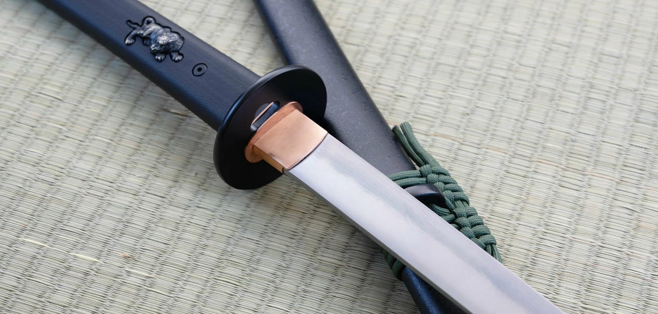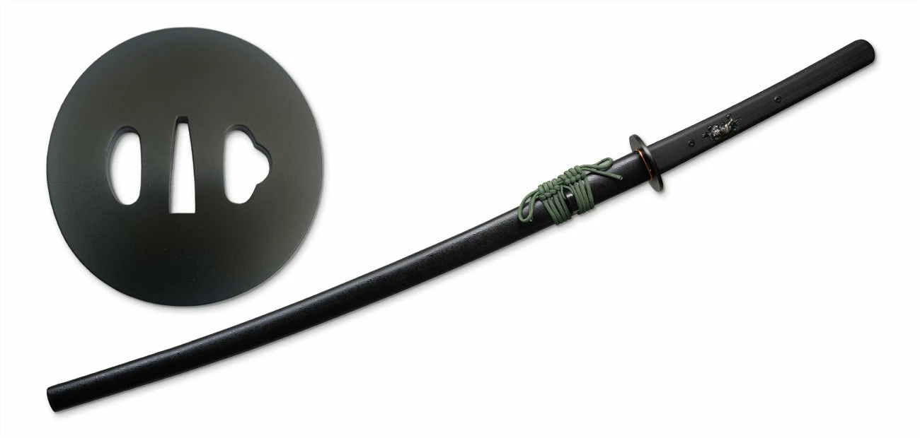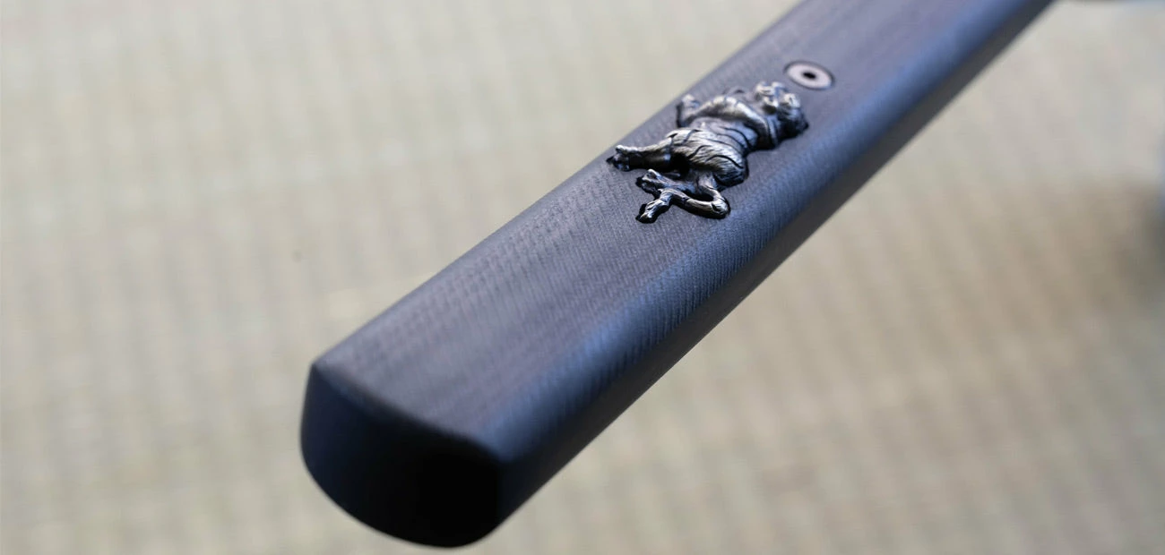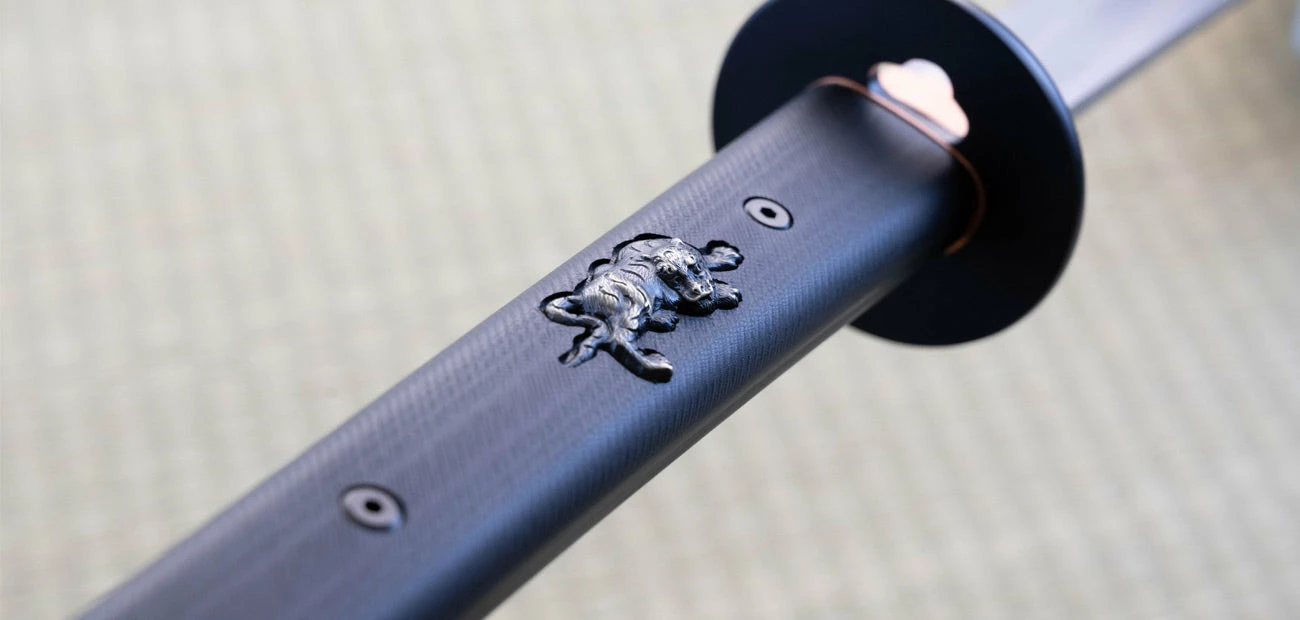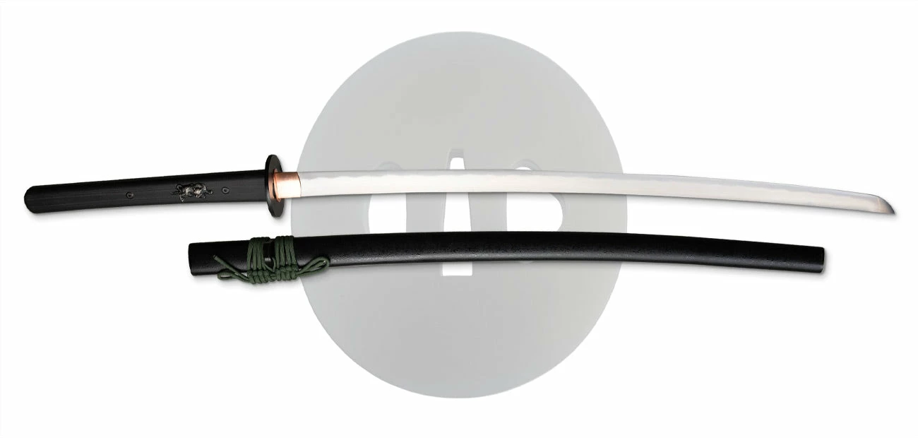 The differentially tempered 27” 1566 steel blade features a real hamon line with a copper habaki and seppa. The tsuka encapsulates the tang in textured G10 and is dual pinned for a secure grip which is unremovable. The silver menuki on the tsuka are shi shi (lion dogs) which are embedded in the handle. The textured black saya features an olive paracord sageo around a polymer kurikata and kojiri. The Modern Katana also has the Modern Tanto as a companion piece to complete your modern warrior collection.