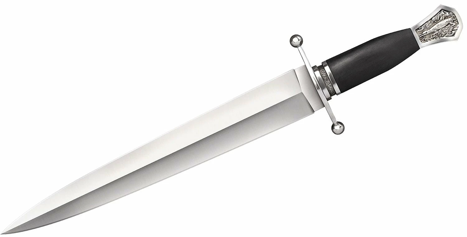 The main competition to the Bowie knife from the late 1830’s to the period just after the Civil War was the Arkansas Toothpick. The Arkansas Toothpick got its namesake as an ironic reference to the coarse, rough and tumble culture that populated the lowlands of Arkansas and the Mississippi delta in the mid 19th century. Travelling journalists from Europe often made up stories about how they commonly saw men and old boys picking their teeth with giant knives that they dubbed Arkansas Toothpicks. Like the Bowie it was frequently a large knife almost always double edged with a sharp acute point. The knife almost always had a double quillon guard and many were fancy and some imitated the Bowies of the day in size and appearance. Sure, some were plain, but most were elaborately decorated. Our version has a substantial double edge spear point blade, with a Malaysian Sal wood handle and a fancy pommel with an alligator motif. The scabbard is equally stunning, it’s finely made and decoratively enhanced to complement the handle.