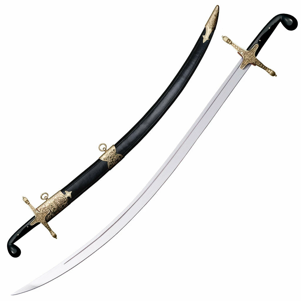 The Cold Steel Shamshir’s expertly heat treated carbon steel blade has a deep curve and a narrow cross section, combined with a keen edge and a very sharp point. It’s complimented by a brass crossbar hilt and a faux buffalo horn handle that terminates in a distinctive bulbous pommel. The pommel is slightly down turned to keep the wielder’s grip as secure as possible when making hard cutting strokes. The beautiful hand-made scabbard is made of thick black leather (so it won’t dull the blade) and reinforced by a brass throat and chape. The scabbard also comes complete with dual suspension rings for ease of carry or display.