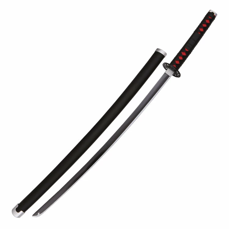 | Demon Slayer Tanjiro Kamado’s Nichirin Sword -Matte black blade -Black leather handle wrap overtop red rayskin -Metal pommel and handle collar -Black leather covered saya with metal accents |