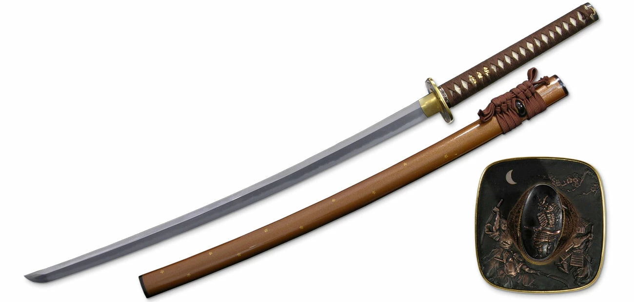 Bushido, or “Way of the Warrior”, defines the code of conduct an honorable Samurai must follow and the Hanwei Bushido katana is designed to perpetuate this tradition. The blade of the Bushido katana is hand-forged and folded from K120C powder steel, with a medium-length (chu) kissaki. The saya is deeply lacquered with inlaid brass cherry blossom (sakura) flowers. High quality ray skin (same) is used on the tsuka. The tsuba is crafted in blackened and bronzed iron, with detailing in gold and silver and a battle scene decoration. The tsuka-ito and the sageo are woven from premium Japanese cotton. The fuchi and kashira are of blackened bronze with brass detailing, and the kojiri, koiguchi and kurikata are of polished buffalo horn. The habaki is a one-piece brass construction.
