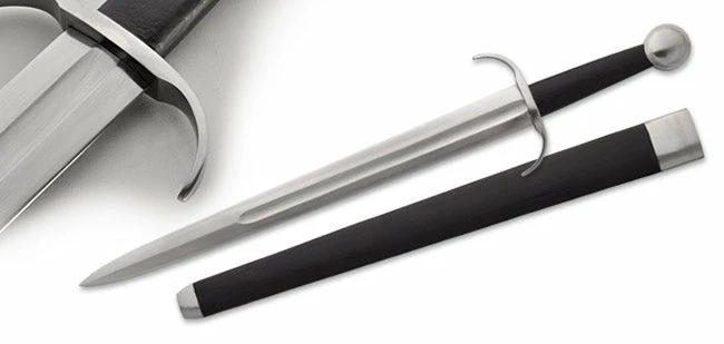 The blade of this sword is hand forged from 5160 carbon steel and hand tempered. The blade is then securely peened at pommel. The handle is wood wrapped in black leather. Sword also includes a wood scabbard wrapped in black leather with steel accents at throat and tip.
