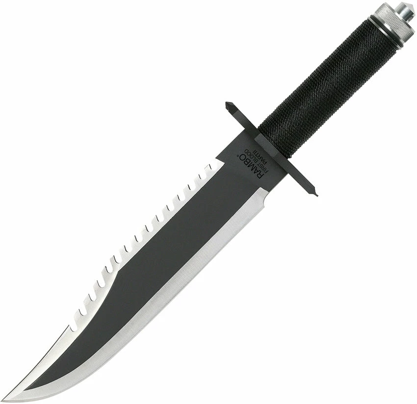15″ overall. 10″ black finish stainless blade with sawback and polished edges. Hollow handle wrapped in heavy black nylon cord. Aluminum butt cap with precision compass. Survival kit. Stainless guard with lashing holes and integrated Phillips and standard screwdrivers. Top grain leather belt sheath with leg tie.