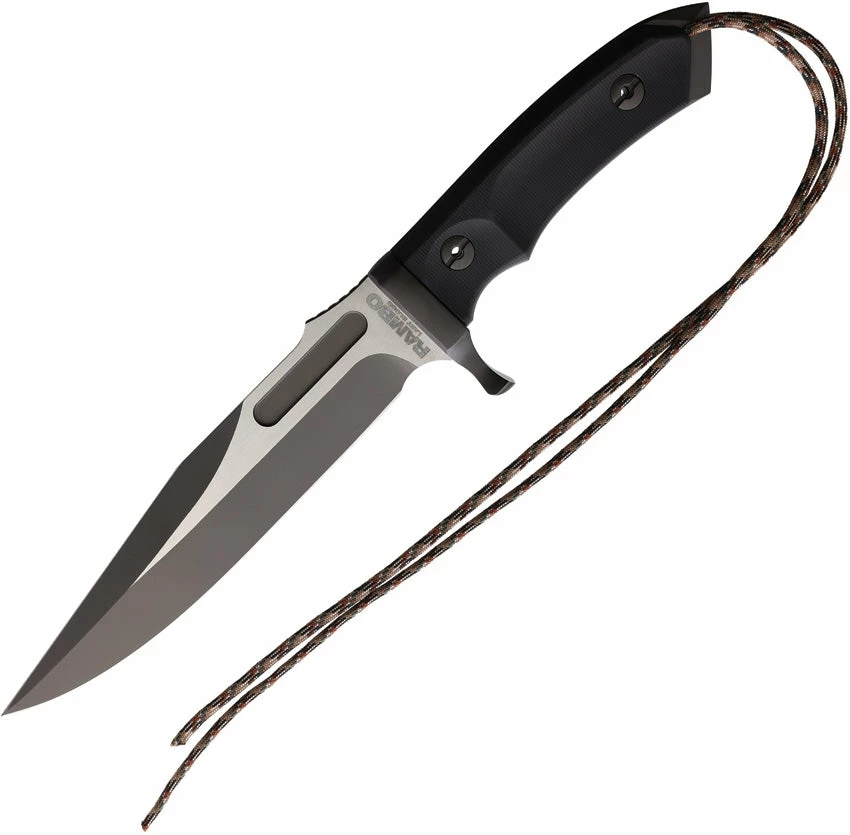 14″ (35.56cm) overall. 8″ (20.32cm) stainless bowie blade. Black sculpted synthetic handle. Hand ground and polished finish blade. Black buffalo hide leather belt sheath. Camo paracord lanyard.