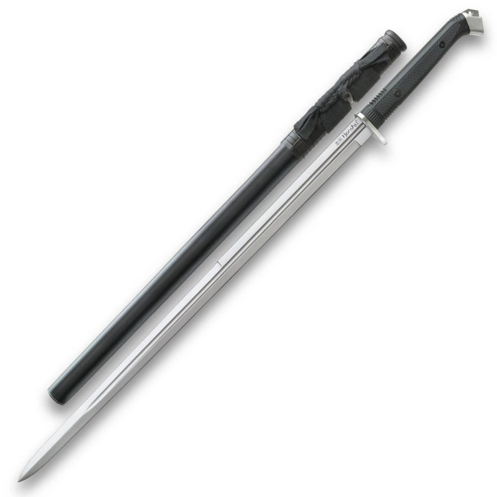 The Honshu Boshin Double Edge Sword fuses tradition and innovation to yield a masterwork of modern sword design. The sword boasts a 30 1/2” 1060 high carbon steel blade that’s unrivaled in sharpness and strength. Trading traditional trappings for sleek contemporary style, the cutting edge Boshin is an undeniably modern weapon. Textured TPR shrouds the handle for an ergonomic no-slip grip and the handle is crowned with an oversized polished steel pommel. The guard snubs fanciful ornamentation in favor of a practical pointed ellipse design. In keeping with the Boshin sword’s clean, functional motif, the scabbard is wooden with a semi-gloss black finish and features black faux leather wrapping and cotton cord. Wielding the Honshu Boshin Double Edge Sword is almost Zen-like – you just have to experience it for yourself!
