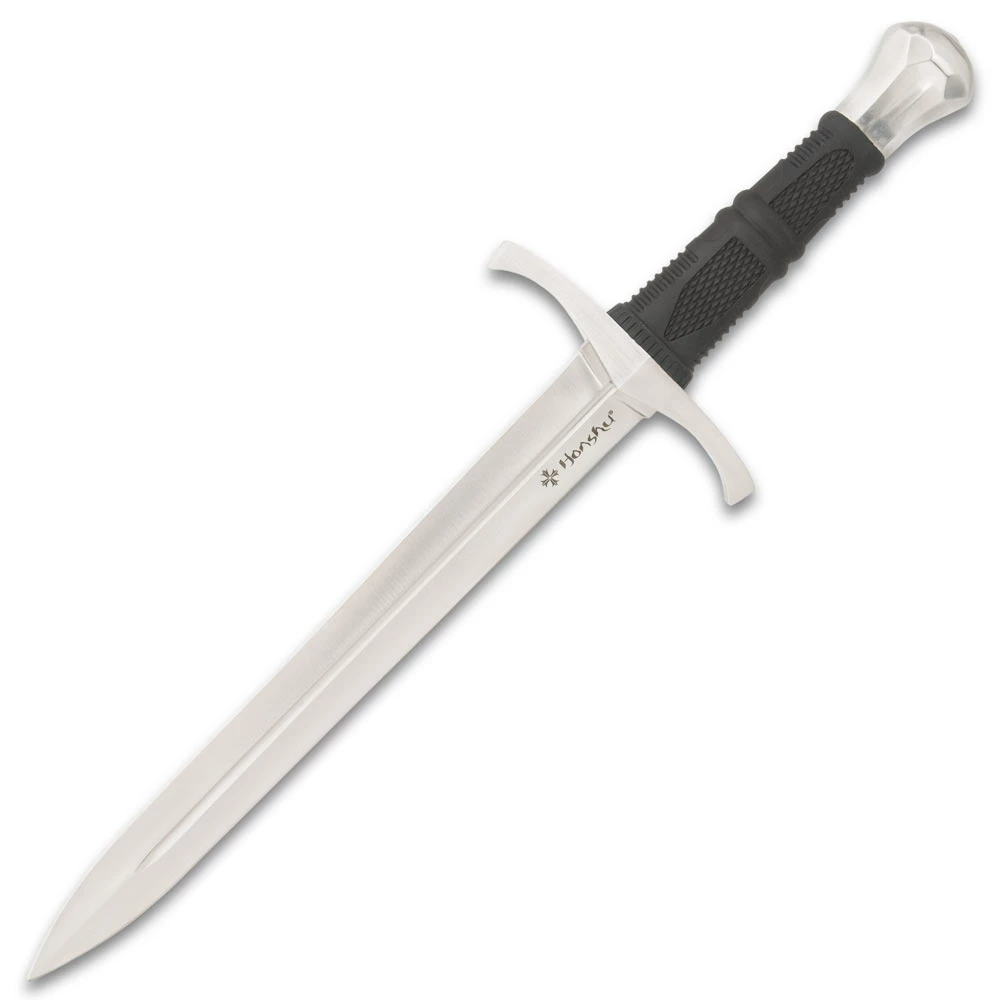 The Honshu Crusader Quillon Dagger was designed specifically to accompany the Honshu Broadsword as a parrying dagger. This fixed blade knife has a keenly sharp, 11 7/8” 1060 carbon steel blade with a satin finish and a blood groove. The textured and ridged, injection-molded TPR handle gives you a secure, slip-free grip even when the conditions are wet. The grip is bookended by a cast 2Cr13 stainless steel pommel and hand guard, both with a satin finish. The 18 5/8” overall dagger can be carried and stored in a genuine black leather belt sheath with snap closure strap.