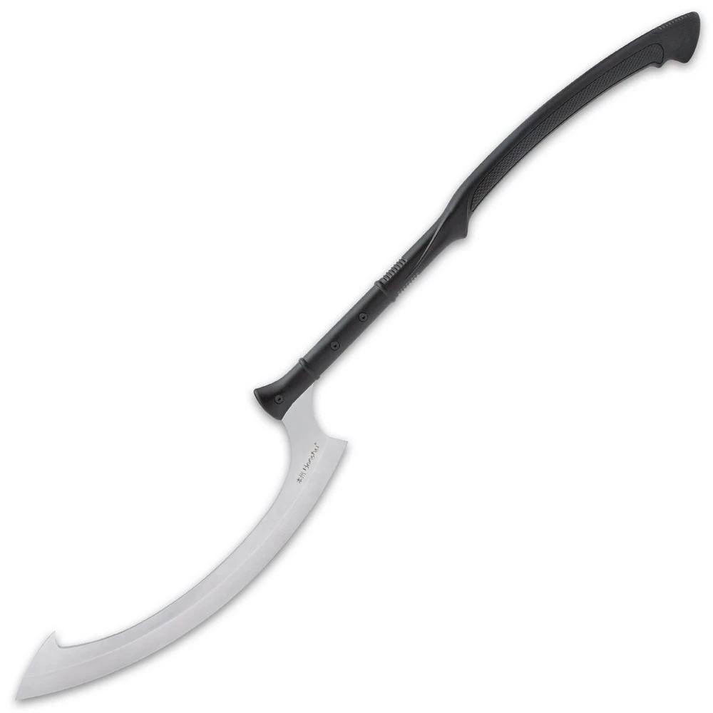 The Honshu Khopesh is a reimagining of the Egyptian sickle-shaped sword that have been found in the burial chambers of Pharaohs. The Egyptian sword has a razor-sharp, 19 1/2” curved, 7Cr13 stainless steel sickle-style blade with a satin finish. The curved handle is crafted of impact-resistant, injection molded nylon and it has a heavily EDM textured grip. The 45 1/8” overall khopesh sword comes with a premium leather blade cover with a double-snap closure.