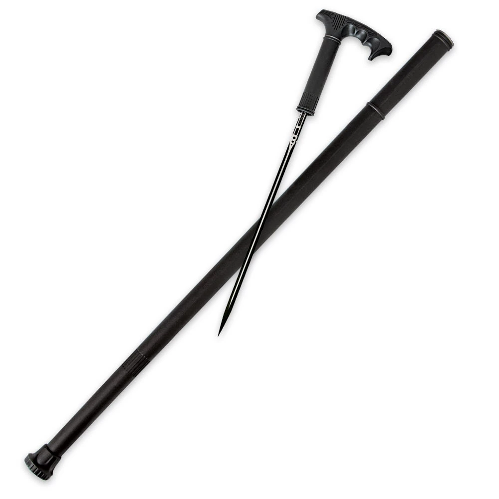 This heavy-duty sword cane is a beast when it comes to self defense! Features a lighting fast blade draw. No clumsy unlocking buttons or unscrewing needed! The unique design features a tonfa styled handle grip, the reverse of a normal walking cane. The handle is gripped under hand like a traditional asian tonfa, created a more secure non-slip hold for walking and allowing for a quick release and thrust-punch of the blade spike. The 16 3/4″ blade is a solid spike of cast 2Cr13 stainless steel with a black oxide and satin finish. The cane shaft, handle, and grip are constructed of virtually indestructible fiberglass reinforced nylon, locked together with a rubber o-ring friction lock design. The large, non-slip rubber toe can be removed to allow the cane shaft to be cut shorter for a custom length to suit the individual. Instructions for shortening are included.