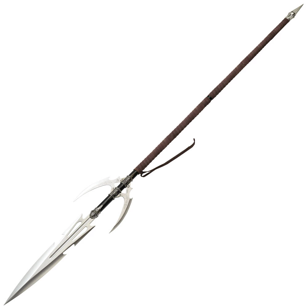 Allaxdrow is the mate of the Ellexdrow spear (KR0050). It was forged by Toukol for Estea, one of the first Mithrodin Warriors, keepers of the Swords of the Ancients (from the Swords of the Ancients mythology). Allaxdrow features three 420 stainless steel blades, a blackened steel shaft with leather wrapped grips, and finely detailed solid metal fittings. Each spear is serial numbered and marked with a laser engraved Kit Rae emblem, also, including a certificate of authenticity. The fantasy spear is 69 1/2” in overall length and it ships disassembled in two sections.