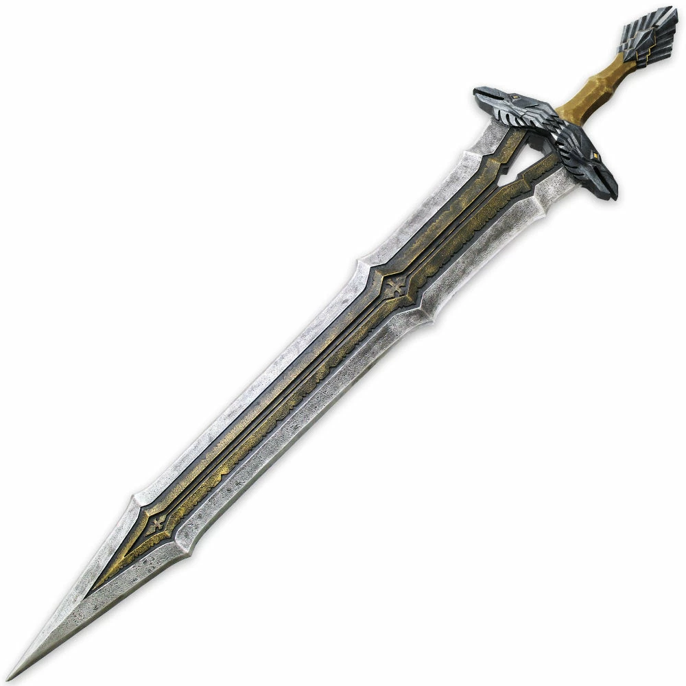 A Polyresin prop replica of the iconic Dwarven sword wielded by king Thror in The Hobbit: An Unexpected Journey, now wielded by his grandson Thorin Oakenshield in The Hobbit: The Battle of the Five Armies. The design of this richly detailed prop represents the regality of the Dwarven kingdom of Erebor, featuring an ornately sculpted raven hilt with gold accents and a gold inlaid blade. Crafting this massively thick sword blade in real steel was not possible outside of Middle-earth, so we have exactly replicated the Urethane and aluminum filming prop in polyresin with screen-accurate detailing, hand-painted colors, and weathering effects. Comes with a 3-dimensional poly stone wall display sculpted to match the styling of Thorin’s regal war shield. Each piece is individually serial numbered and includes a certificate of authenticity.