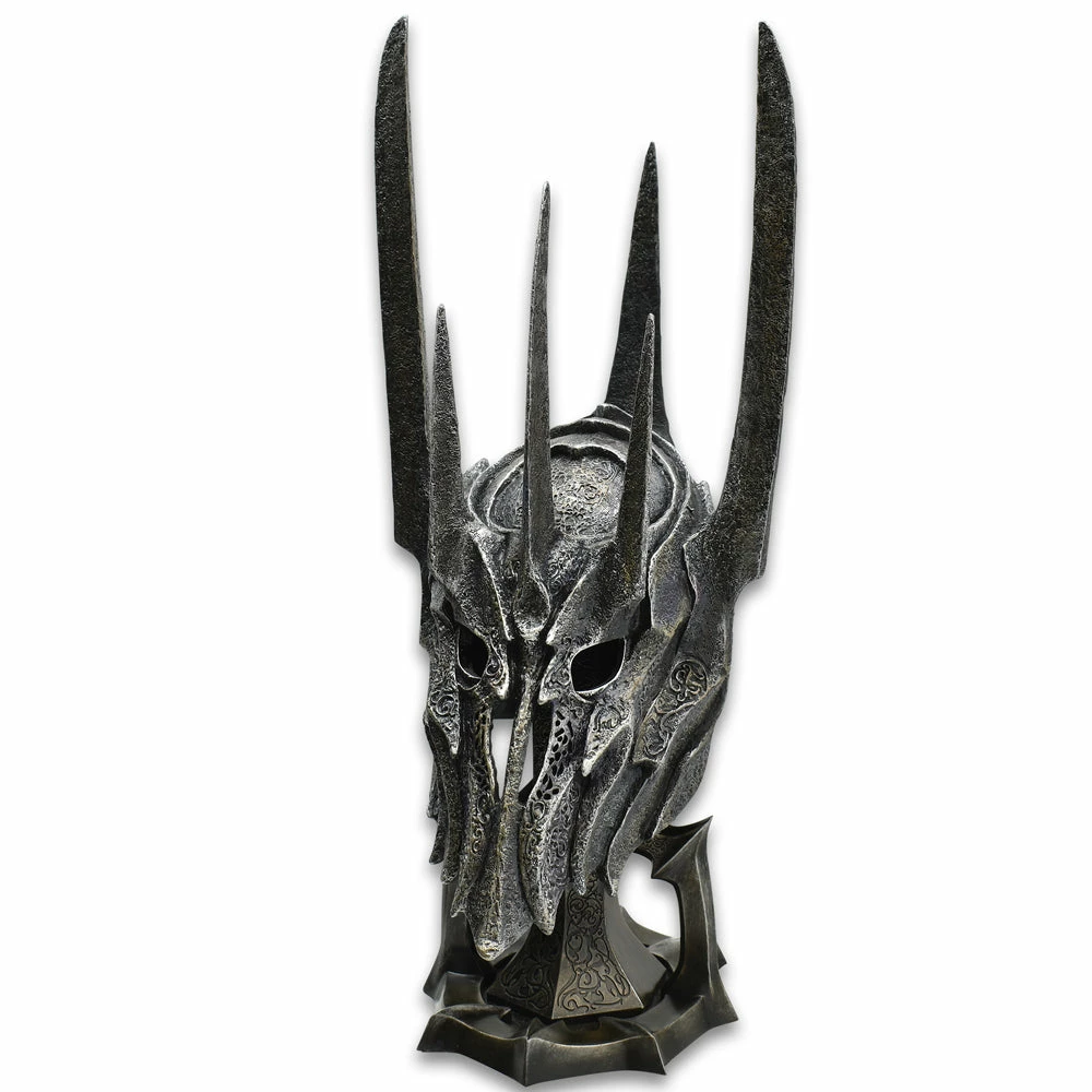 A half-scale replica of the blackened steel war helm of the Dark Lord Sauron, as seen in the motion picture, “The Lord Of The Rings: The Fellowship Of The Ring”. This is a scale reproduction of the actor-scale filming prop built by the film’s production team. United Cutlery, industry leader in fine movie reproductions, has meticulously recreated the actual prop helmet using an original movie prop casting for reference. This half-scale polyresin replica is 15 1/2” tall. It features weathered intaglio-etched surface sculpting and blackened sleek coloring that precisely match the original movie prop. Close attention to detail is a top priority in every piece. It is presented with a polystone display stand sculpted in the same styling as the mace and armor of Sauron and includes a certificate of authenticity.