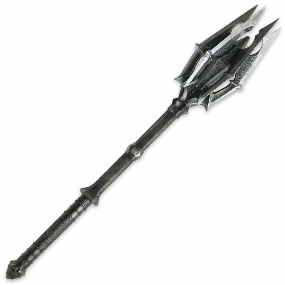 This replica of the actor scale prop used in the movie is crafted of steel reinforced polyresin with an aged iron finish. Close attention to detail is a top priority in every piece, down to the intaglio-etched surface and corroded metal coloring. The oversized One Ring worn by Sauron is also included, crafted in gold plated solid metal. Displays on a poly stone wall mount (mounting hardware and instructions included).