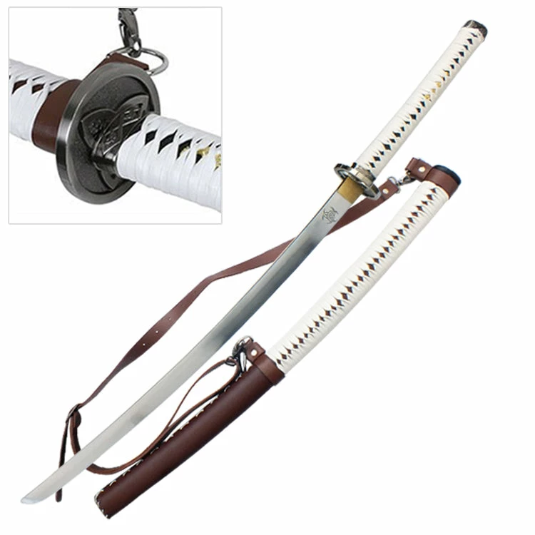 | Michonne Zombie Tamer Katana -1060 high carbon blade -White leather handle wrap with stainless steel tsuba and pommel -Brown leather covered wood Saya with White leather grip and carry belt mountings -Leather carry belt included |